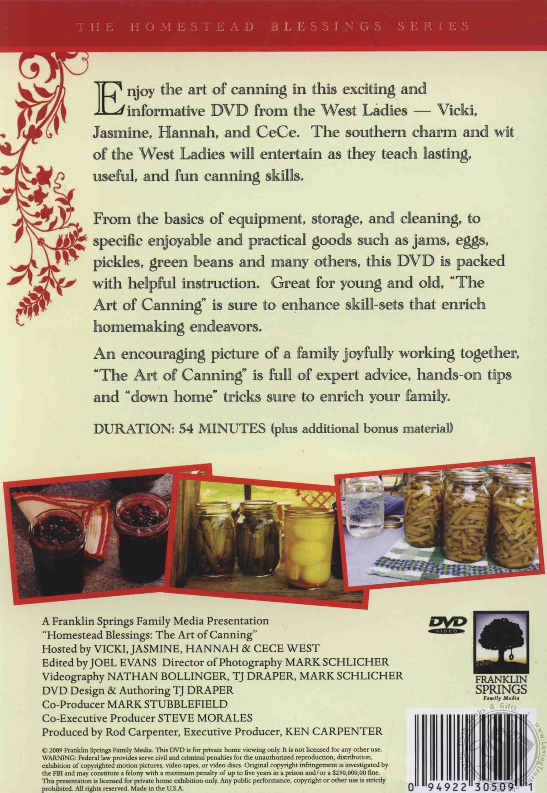 The West ladies are back - Jasmine, CeCe, Vicki, and Hannah - with an exciting instructional and inspirational DVD. The Art of Canning will teach the basics of canning as well as more advanced techniques and tricks that come from years of experience. This DVD is sure to provide you with the skill-sets you need to can a wide variety of fruits and vegetables.