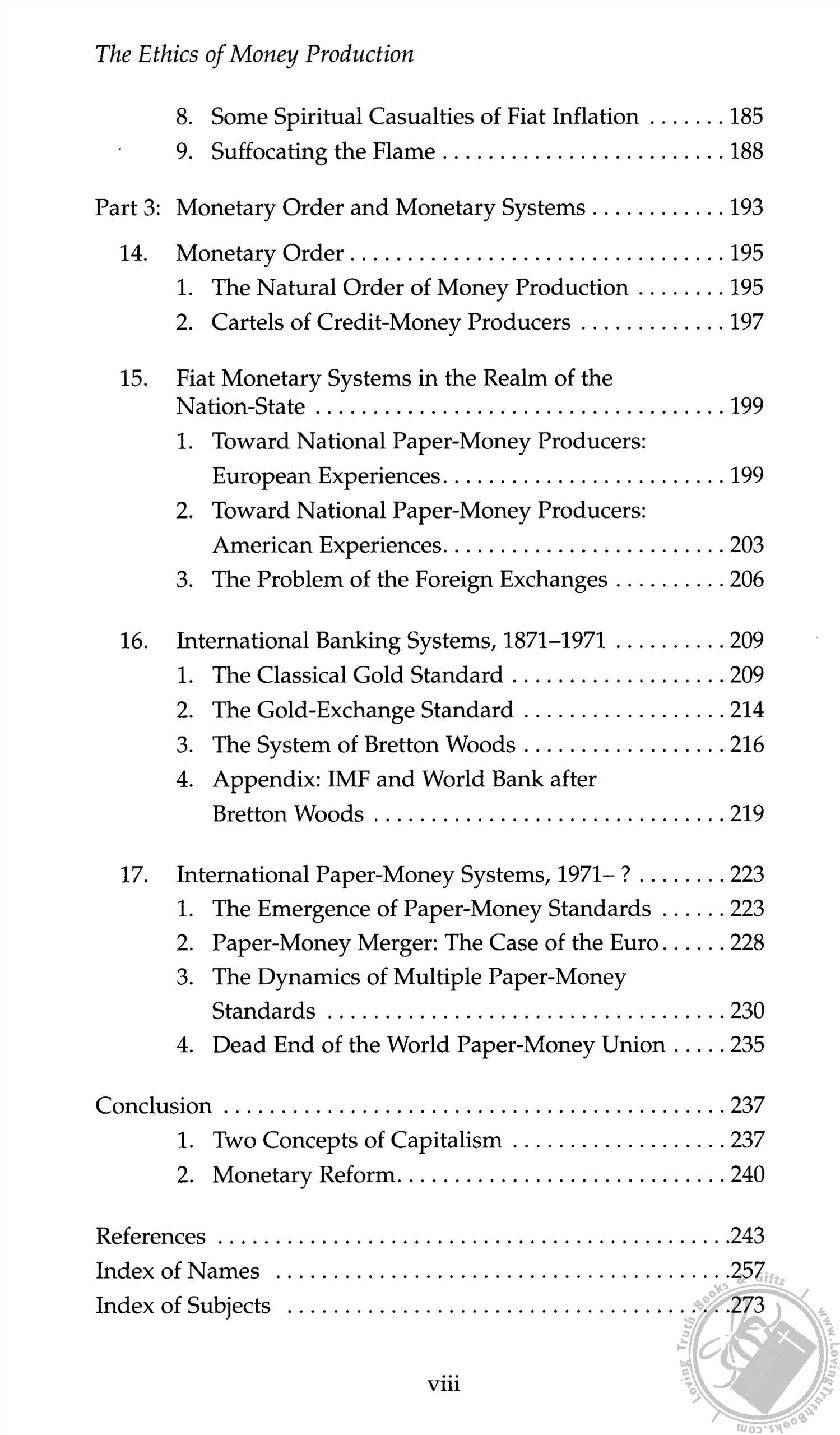 He takes on the "stabilization" advocates to show that government management doesn't lead to stability but to inflation and instability. He goes further to argue against even the theoretical case for stabilization, to say that money's value should be governed by the market, and that the costs associated with private production are actually an advantage. He chronicles the decline of money once nationalized, from legally sanctioned counterfeiting to the creation of paper money all the way to hyperinflation. In his normative analysis, the author depends heavily on the monetary writings of 14th-century Bishop Nicole Oresme, whose monetary writings have been overlooked even by historians of economic thought. He makes a strong case that "paper money has never been introduced through voluntary cooperation. In all known cases it has been introduced through coercion and compulsion, sometimes with the threat of the death penalty. . . . Paper money by its very nature involves the violation of property rights through monopoly and legal-tender privileges."