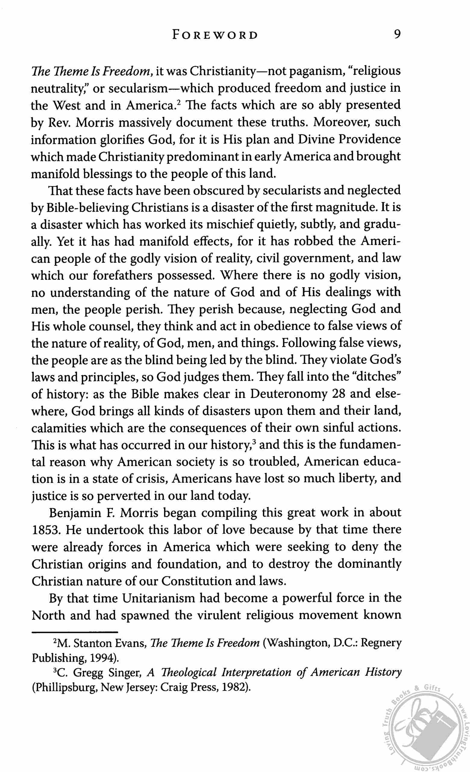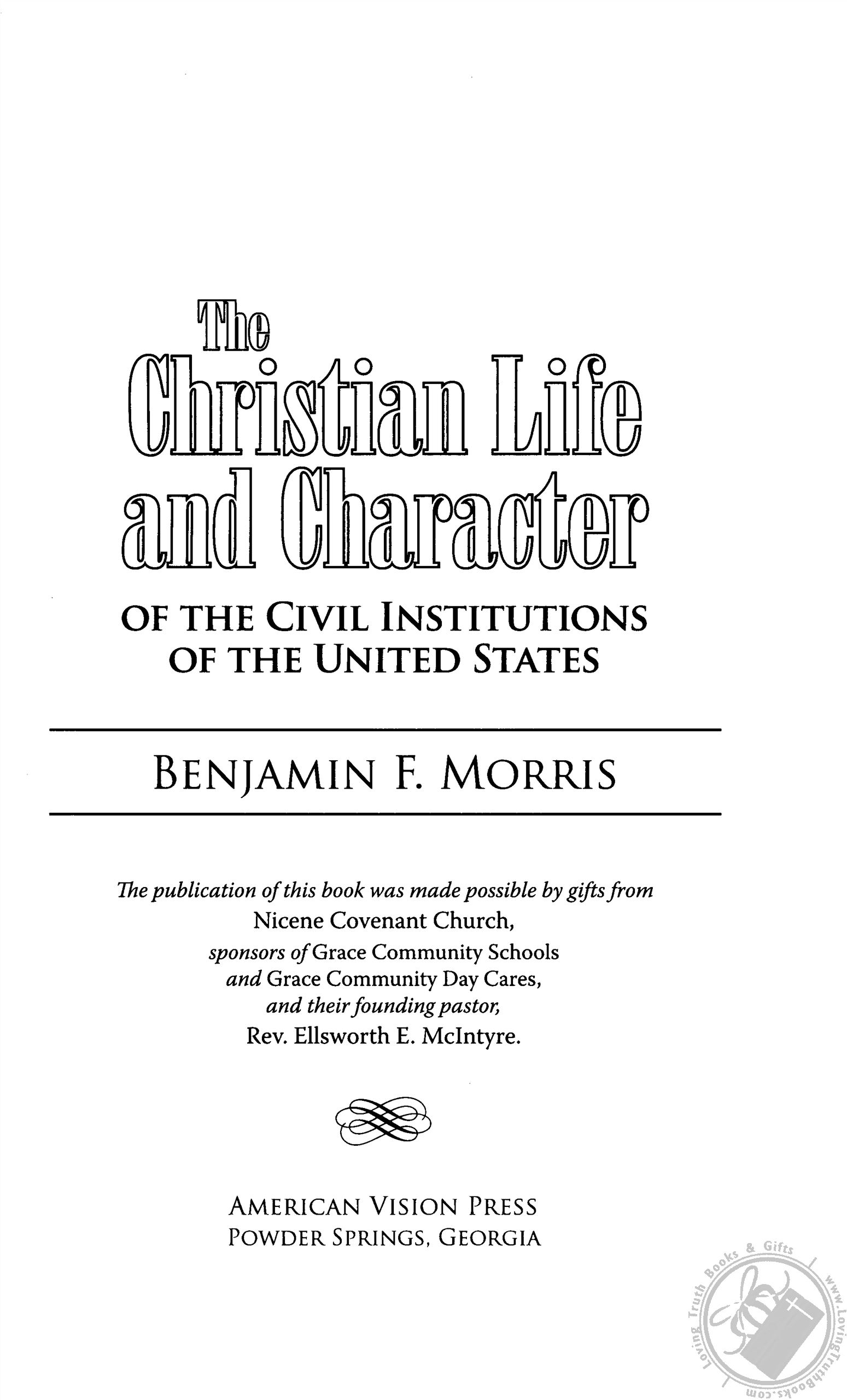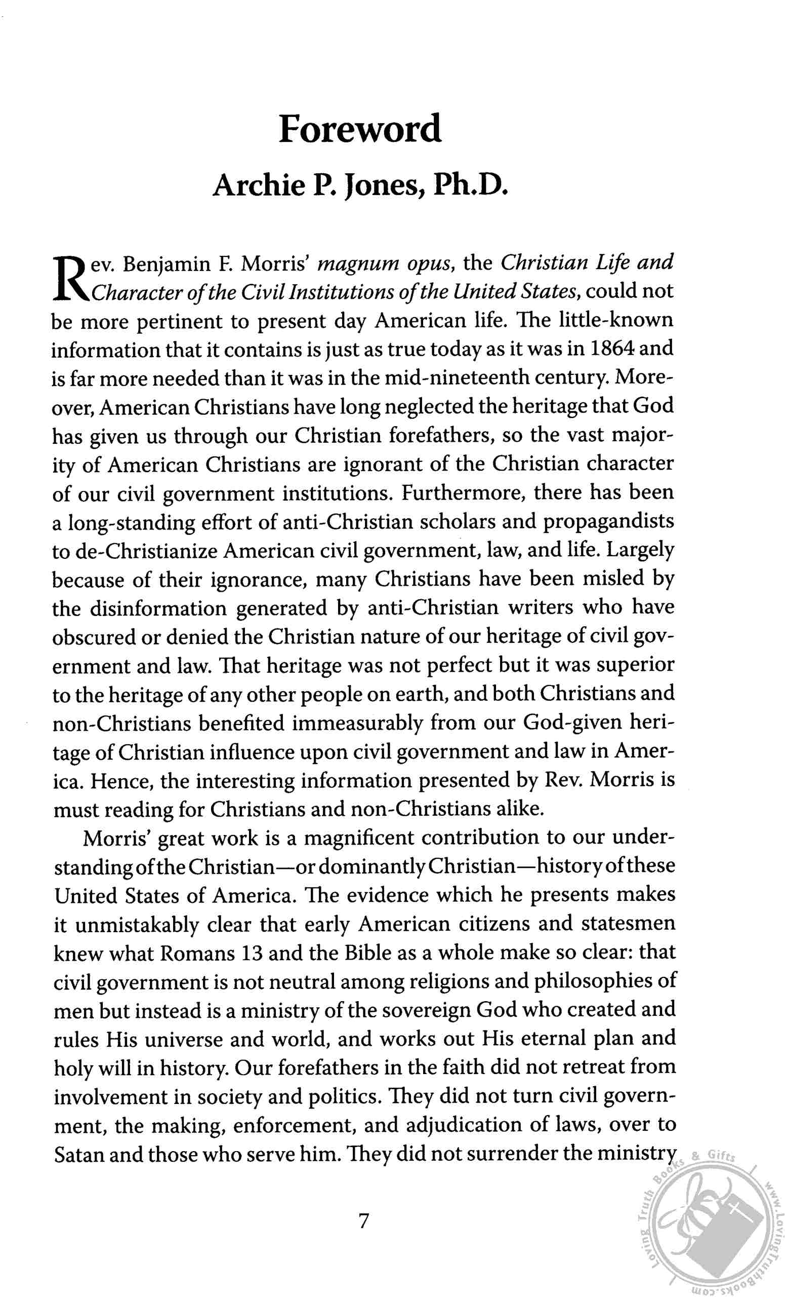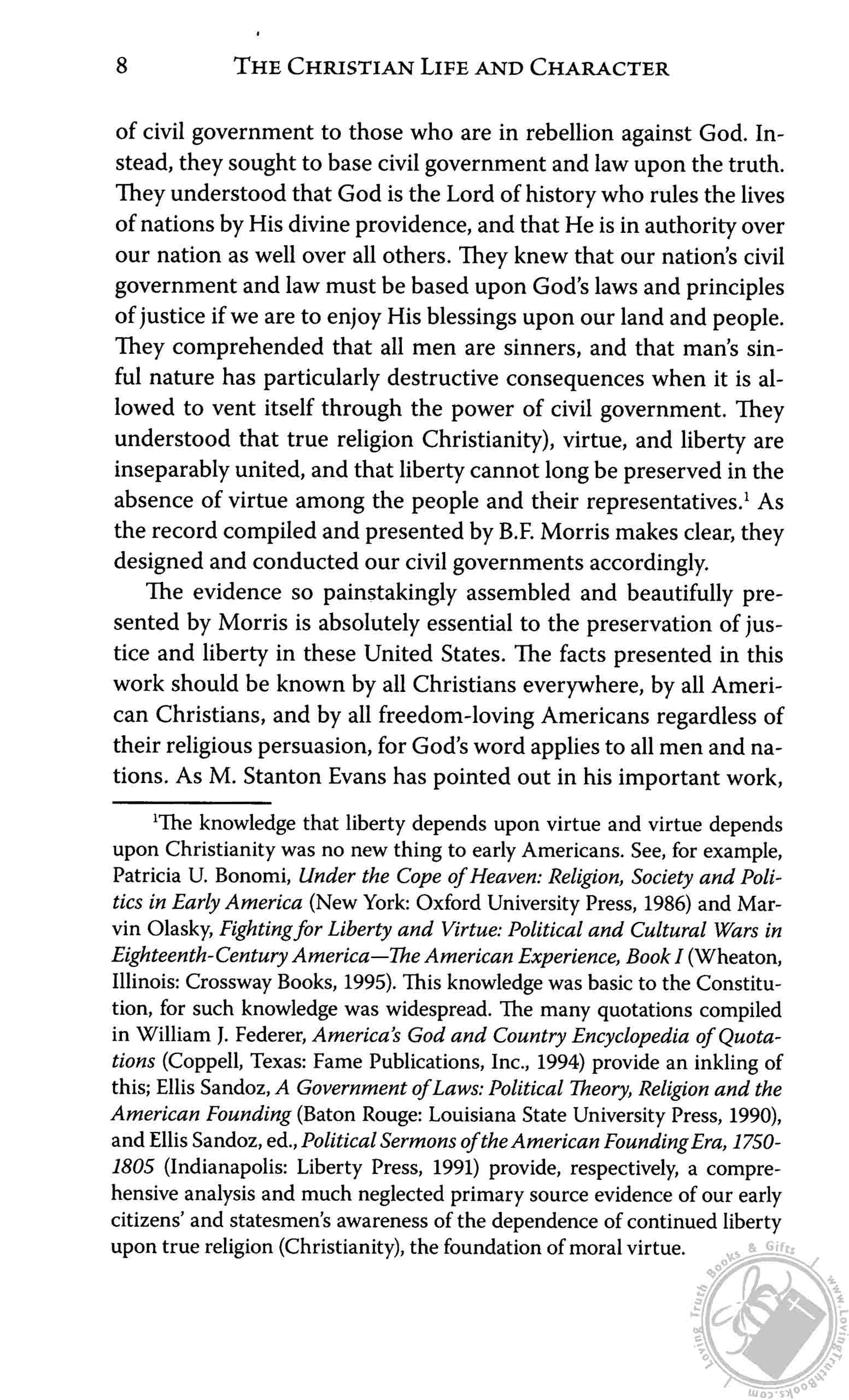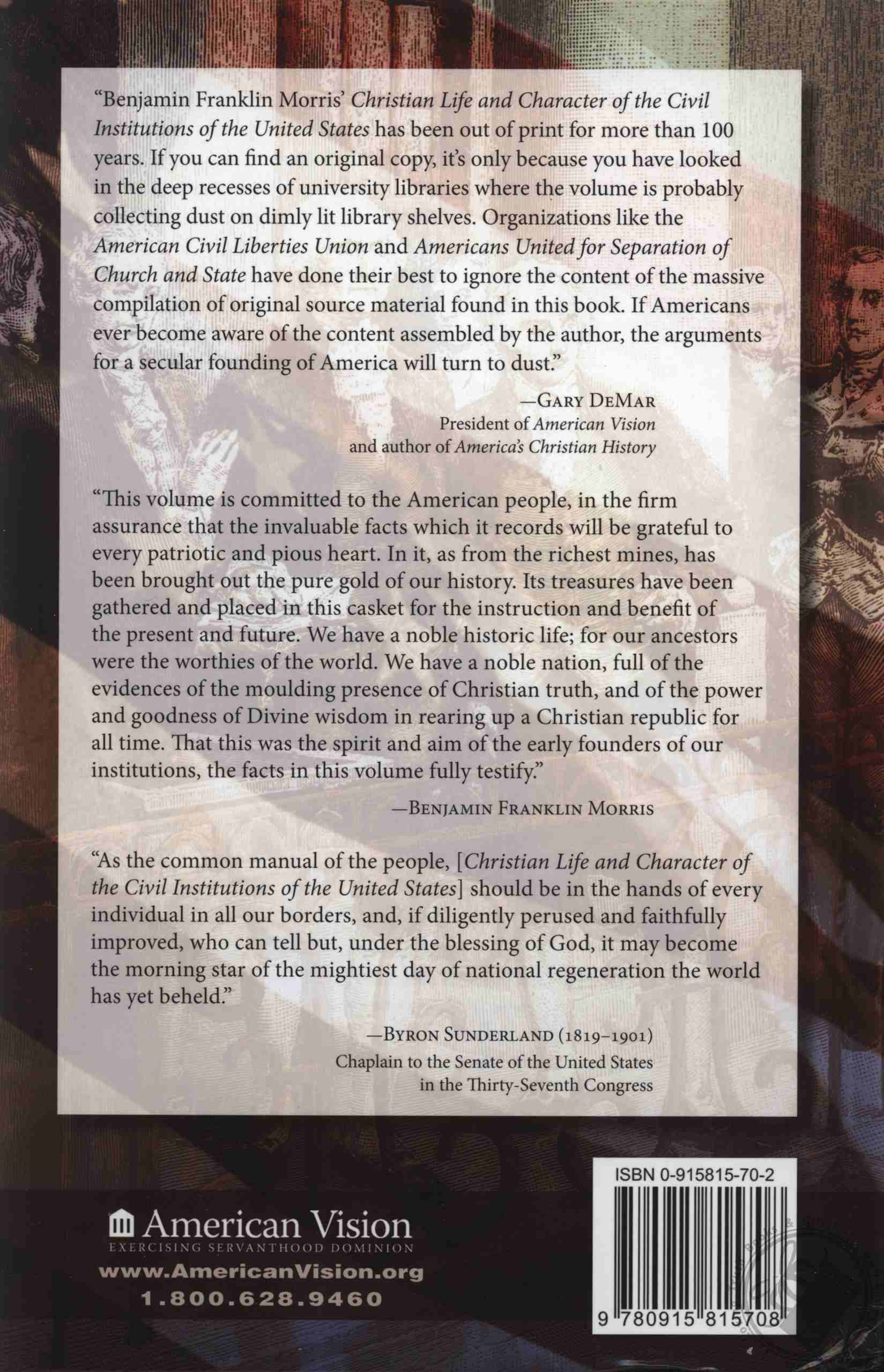 "Be afraid, ACLU. Be very afraid. Morris packs The Christian Life and Character with page after page of original source material making the case that America was founded as a Christian nation. The evidence is unanswerable and irrefutable. This 1000-page book will astound you and send enemies of Christianity into shock. Keep in mind that it was published in 1864 and has been out of print for more than a century. It has been newly typeset using a very readable font and added subheads. A new Foreword written by my long-time friend Dr. Archie Jones describes the background of the book and provides a brief biography of the author." - Gary DeMar