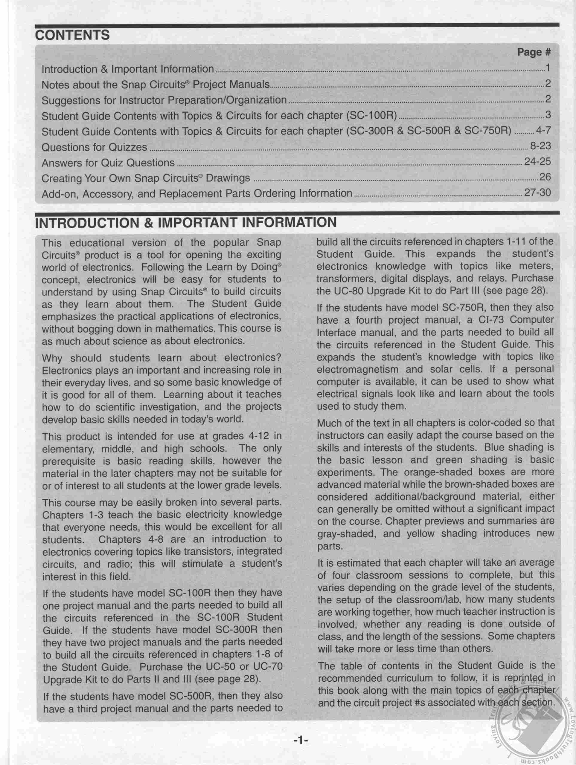 The table of contents in the Student Guide is the recommended curriculum to follow, it is reprinted in the teacher's guide book along with the main topics of each chapter and the circuit projects associated with each section.
