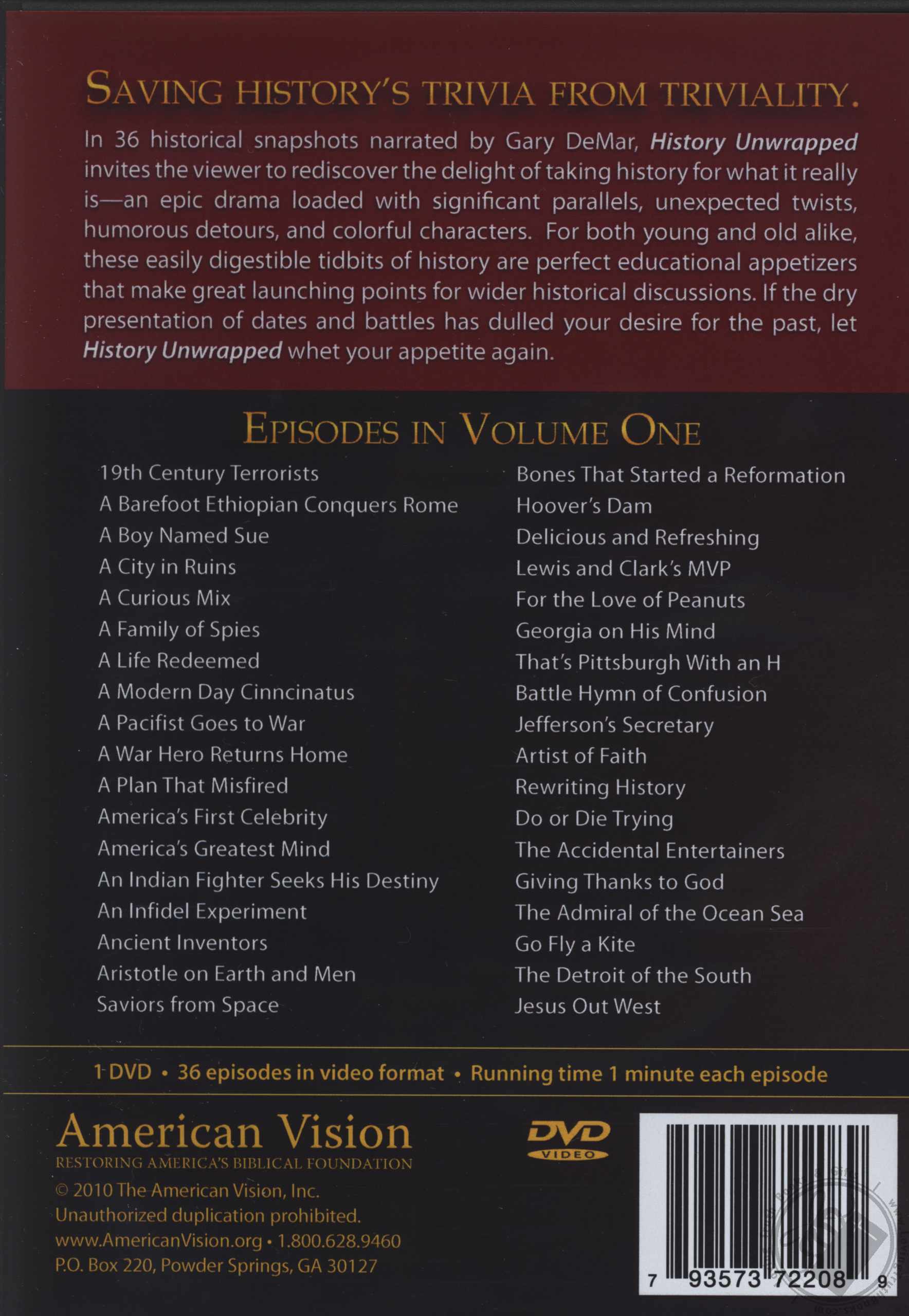 In 36 historical snapshots narrated by Gary DeMar, History Unwrapped invites the viewer to rediscover the delight of taking history for what it really is—an epic drama loaded with significant parallels, unexpected twists, humorous detours, and colorful characters. For both young and old alike, these easily digestible tidbits of history are perfect educational appetizers that make great launching points for wider historical discussions. If the dry presentation of dates and battles has dulled your desire for the past, let History Unwrapped whet your appetite again.