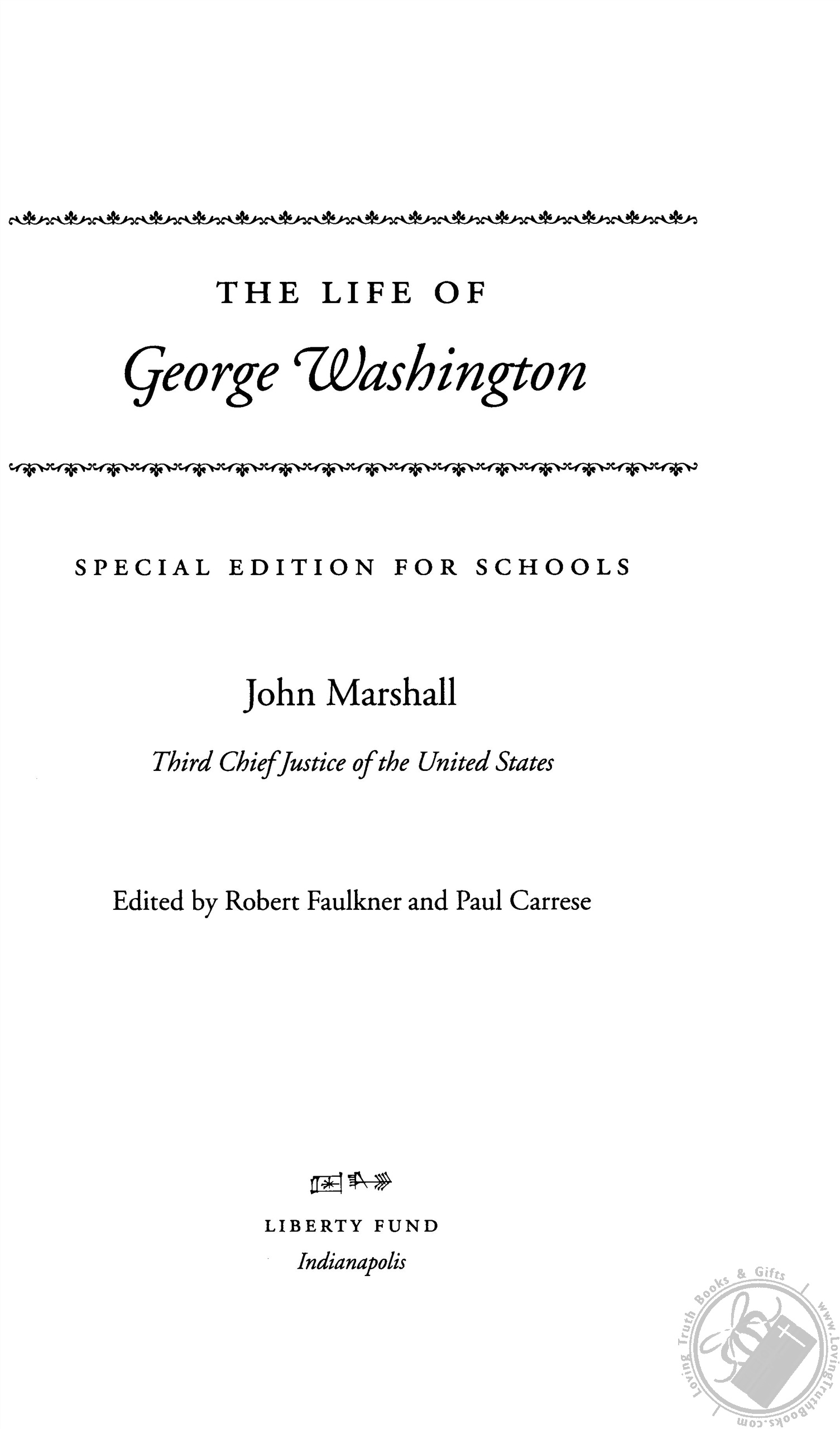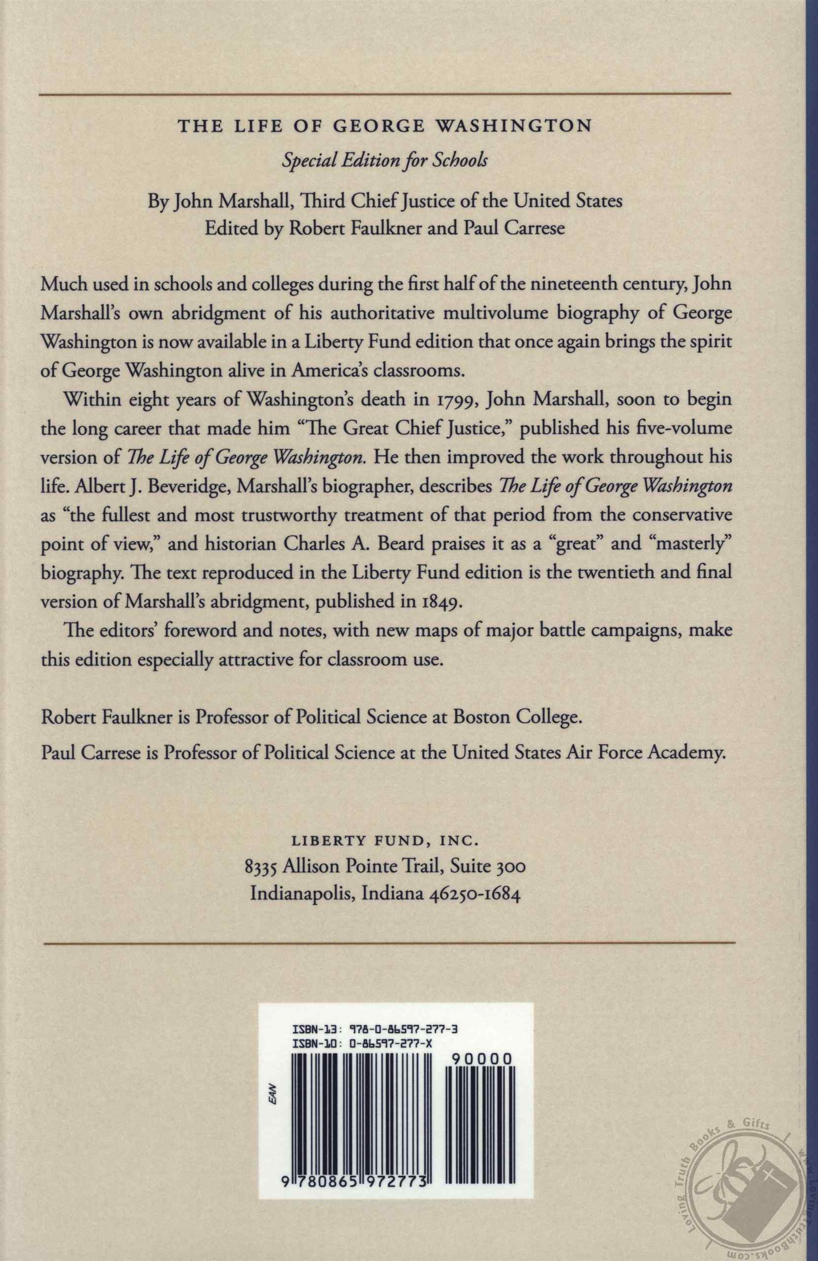 Within eight years of the death of George Washington in 1799, the first major biography of “the father of his country” was written by John Marshall and published in five volumes. Marshall, who later became Chief Justice of the United States Supreme Court, was induced to the task by the first President’s nephew, Bushrod Washington. Marshall’s own principal biographer, Albert J. Beveridge, has described The Life of George Washington as “to this day the fullest and most trustworthy treatment of that period from the conservative point of view.” In fact, so significant is the biography that Marshall later executed a one-volume abridgment, first published in 1838 and used widely for generations in American schools and colleges. The twentieth and final version of the abridgement, published in 1849, is the text reproduced in the new Liberty Fund edition of what Charles A. Beard has praised as a “great” and “masterly” biography.