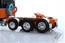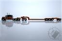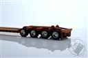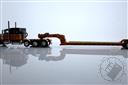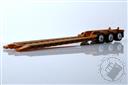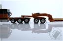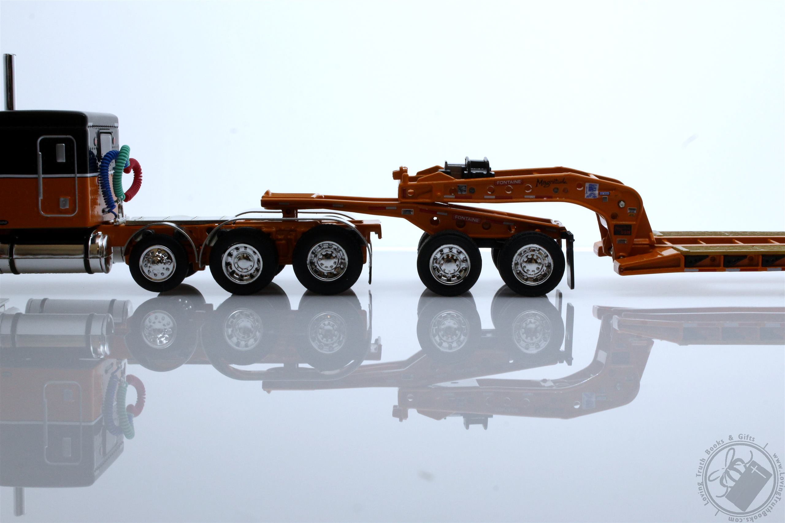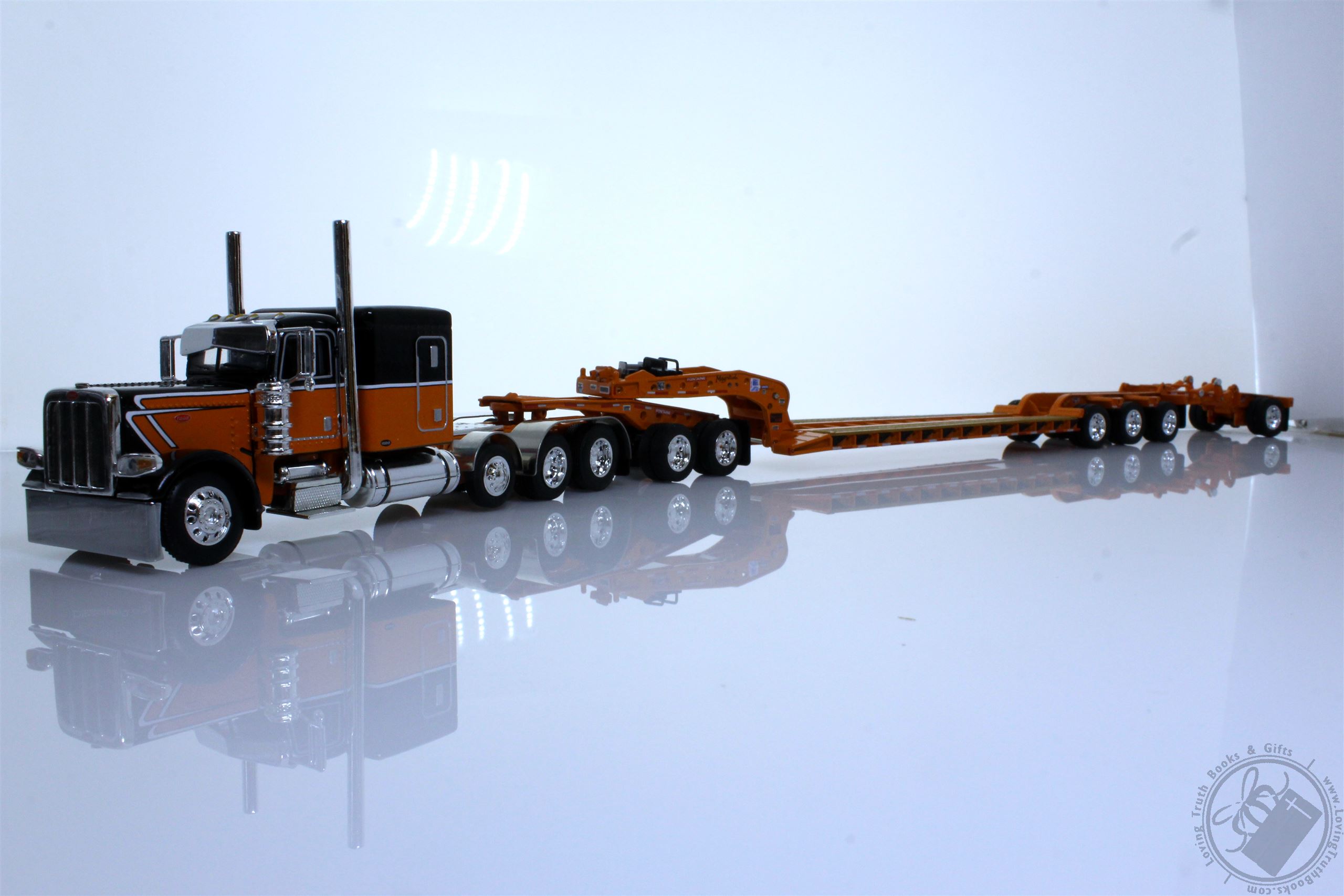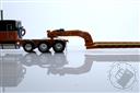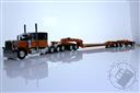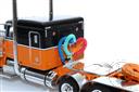 Peterbilt Model 389 with 63" Flat Top Sleeper and Fontaine Magnitude Tri-Axle Lowboy Trailer with Jeep and Stinger in Orange and Black
