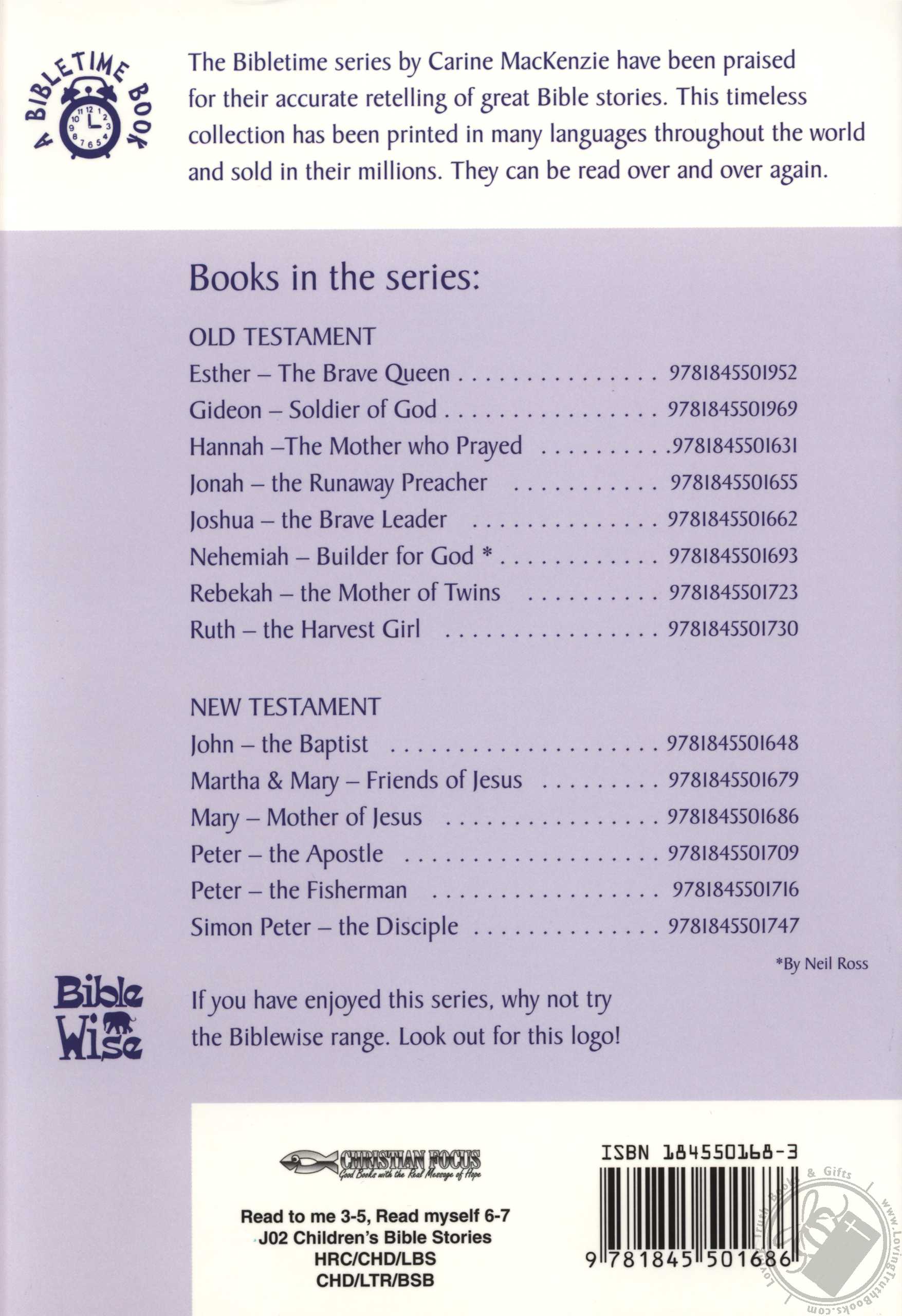 The Bibletime series by Carine Mackenzie have been praised for their accurate retelling of great bible stories. This timeless collection has been printed in many languages throughout the world and sold in their millions. They can be read over and over again.