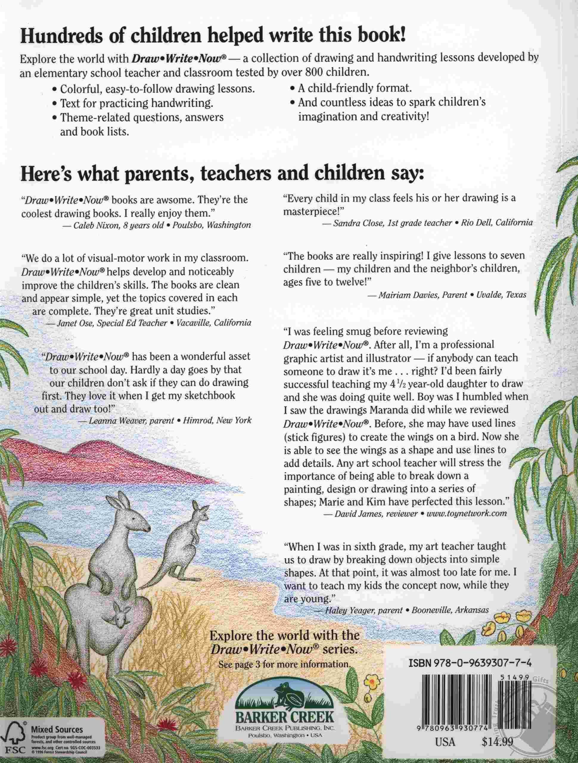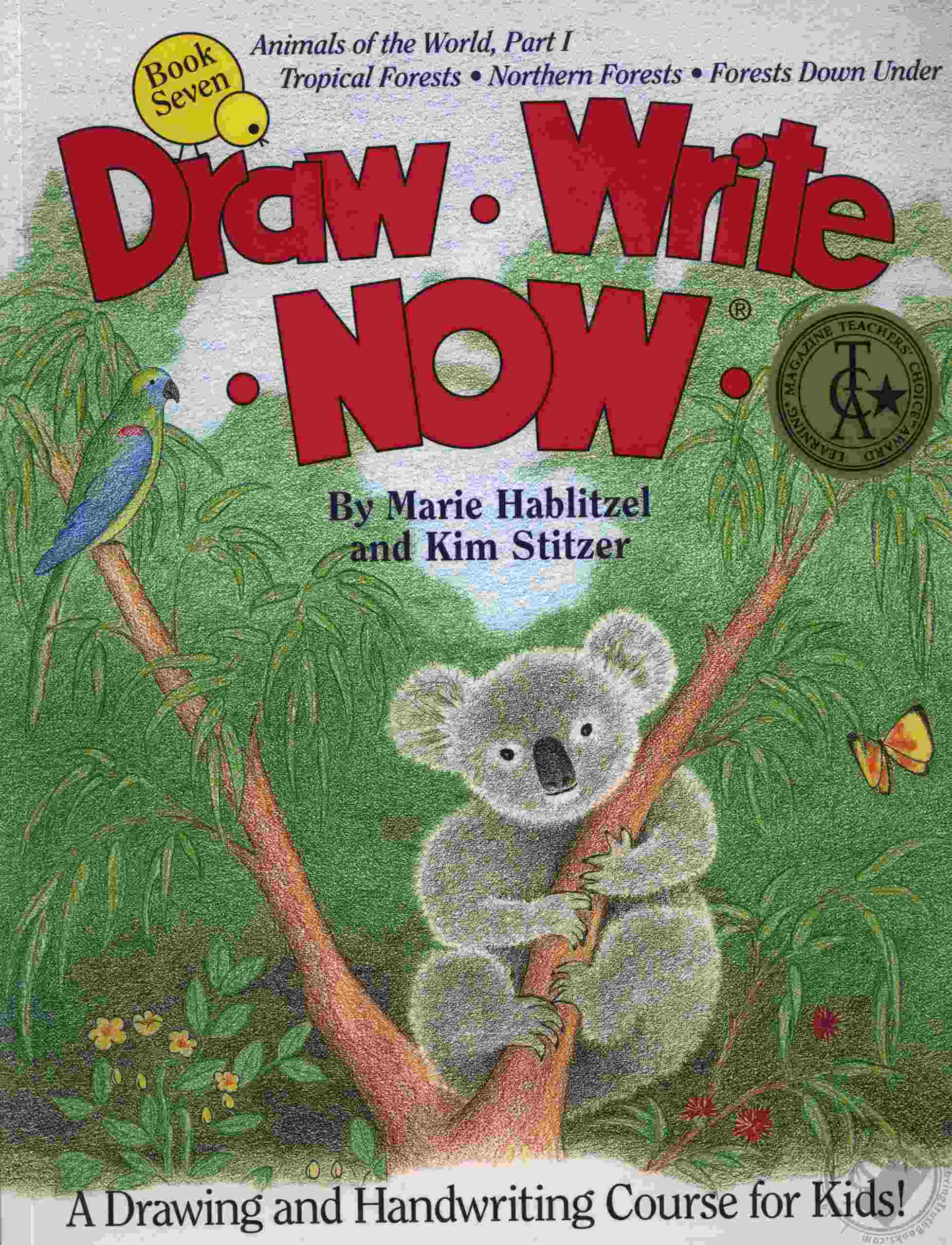 Beginning drawing and writing lessons for children ages five to ten. BOOK 7 focuses on forest animals of the world -- tropical and temperate. The books are simple enough for a young child to do independently, but a teacher or parent may present the lessons. Each drawing lesson includes a colorful picture and step-by-step instructions, while the writing lesson includes four simple handwritten sentences. The teacher or parent may introduce letter formation or have the children copy the sentences for handwriting practice, or use the lessons as a springboard for creative writing or report writing. Developed by an elementary school teacher and co-authored by her daughter. A brief list of the 21 lessons in the book includes chimpanzee, leopard, alligator, toucan, grizzly bear, fox, porcupine, moose, kangaroo, platypus and koala.