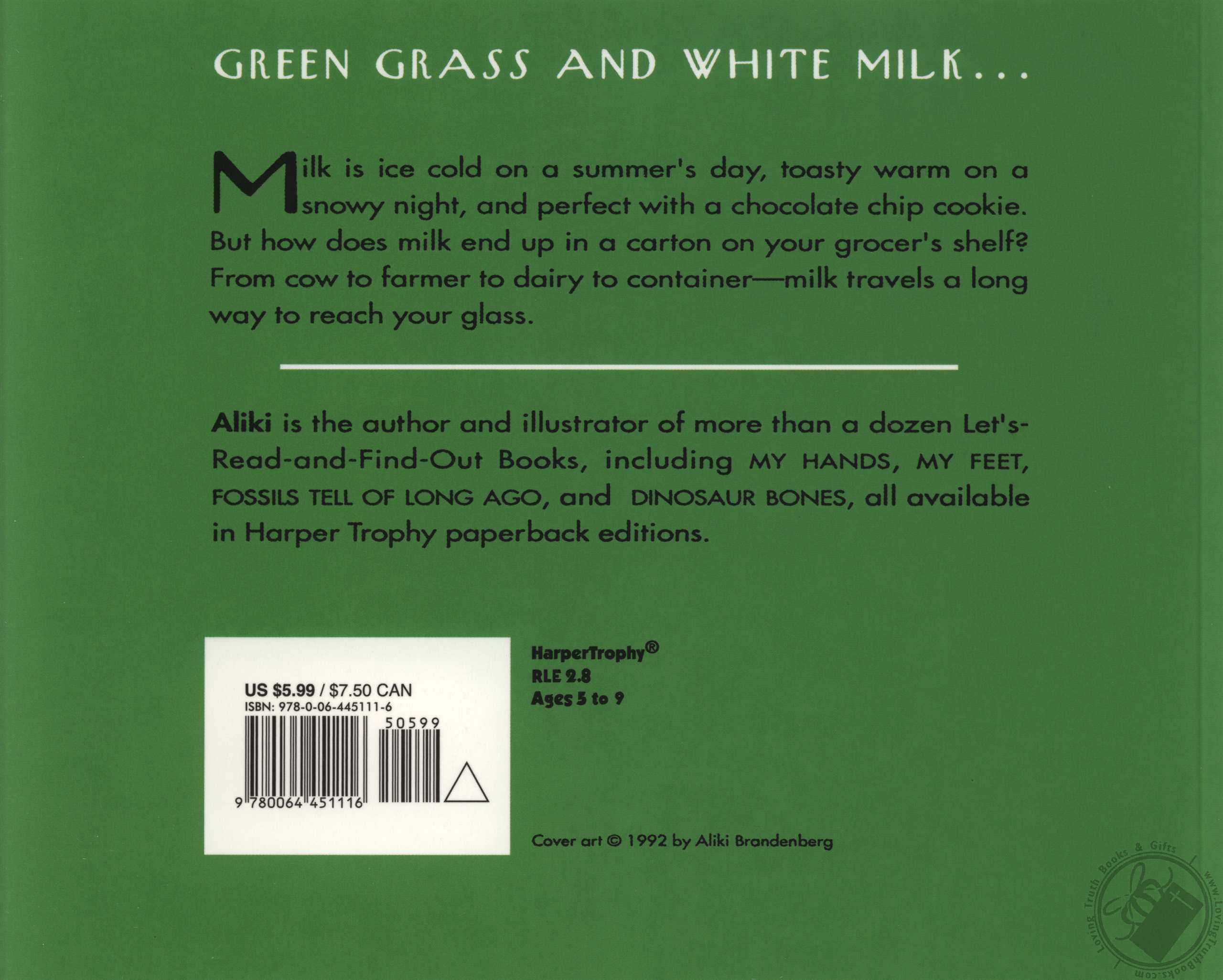 Aliki takes readers on a guided tour that begins with grazing cows, proceeds through milking and a trip to the dairy, and ends with some different foods made from milk. This revised edition of Aliki's 1974 Green Grass and White Milk is an even more fun-filled and informative explanation of milk's trip from green grass, to cow, to a cool glass on the table.